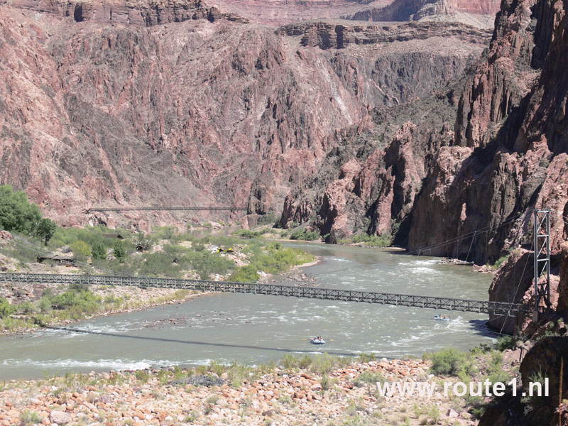 De trail wordt er niet beter op, soms steken de spijkers die de balken moeten vasthouden zo'n 10 centimeter uit en dat betekent dat of de balken zijn uitgesleten of de grond is ingedaald maar het loopt niet echt makkelijk. Bij de kruising met de Tonto trail om 10:23 en maken dankbaar gebruik van het toilet bij de Tipoff. Hiervandaan kunnen we Plateau Point zien waar we hopen te kamperen. We nemen nog wat calorieën en gaan verder en moeten opzij voor een mule train die waar dan ook op de trail voorrang hebben. Het uitzicht is spectaculair en dan is opeens de Kaibab Bridge in zicht. Hij lijkt verraderlijk dichtbij en het zal nog wel een uur duren voordat we daar zijn. Als we bij het water komen valt meteen op dat de waterstand veel lager is dan normaal. Kon je eerder meteen na de brug je voeten in het water afkoelen, nu ligt de waterrand flink verderop.